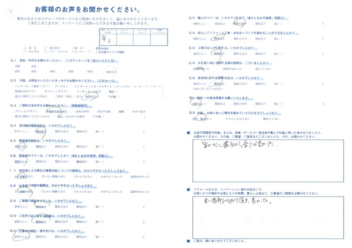 お店の雰囲気や印象。または、営業(サービス)担当者や職人で印象に残った者がおりましたら、お聞かせください。その他、ご要望・ご意見などございましたら、ぜひ、お聞かせください。