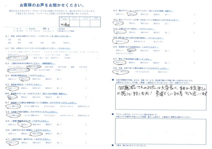 お店の雰囲気や印象。または、営業(サービス)担当者や職人で印象に残った者がおりましたら、お聞かせください。その他、ご要望・ご意見などございましたら、ぜひ、お聞かせください。