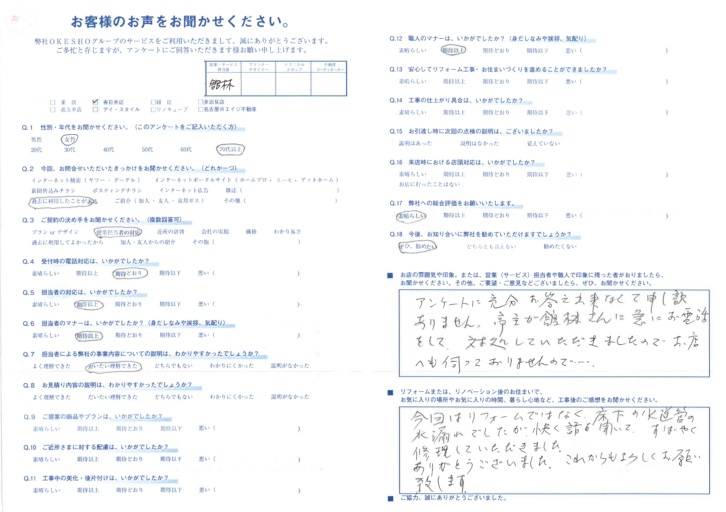 アンケートに充分お答え出来なくて申し訳ありません。亭主が館林さんに急にお電話をして対処していただきましたので、お店へも伺っておりませんので…