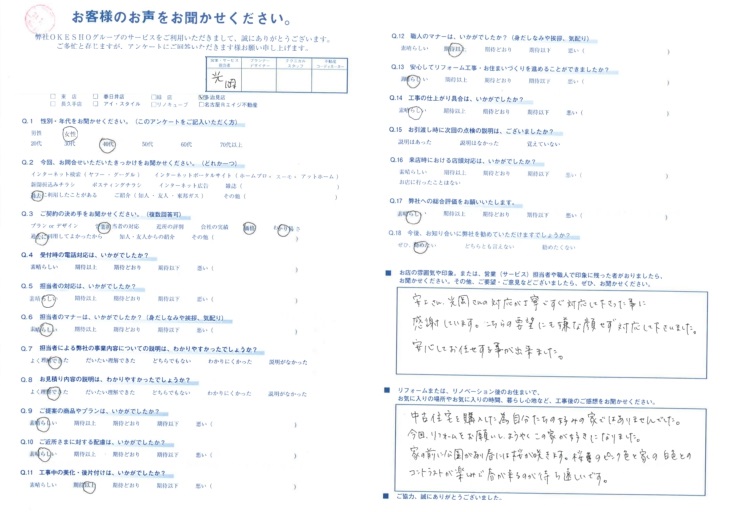 お店の雰囲気や印象。または、営業(サービス)担当者や職人で印象に残った者がおりましたら、お聞かせください。その他、ご要望・ご意見などございましたら、ぜひ、お聞かせください。