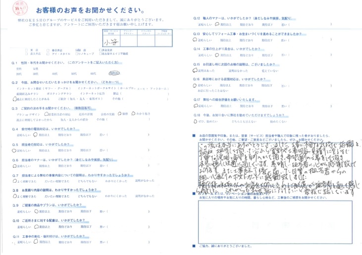 この度は本当にありがとうございました。工事に不安な気持で店頭を訪ね、担当して頂いた方から資料や工事内容、見積りに至るまで丁寧な説明と希望を取入れて頂き、希望通りの工事をして頂き 本当に嬉しく快適に過しています。素晴しい担当者に心から感謝致しております。また工事終了後に届いた自筆の担当者からの細い心配りのポストカードに感動致しました。