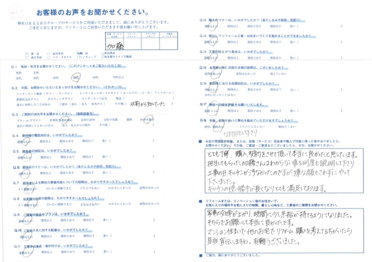 とても丁寧な対応をして下さり、購入、契約をさせて頂いて本当に良かったと思っています。担当してもらった加藤さんはわからない事を何度も説明して下さり、工事の日、キッチンが汚かったのですが嫌な顔もされずにやって下さいました。