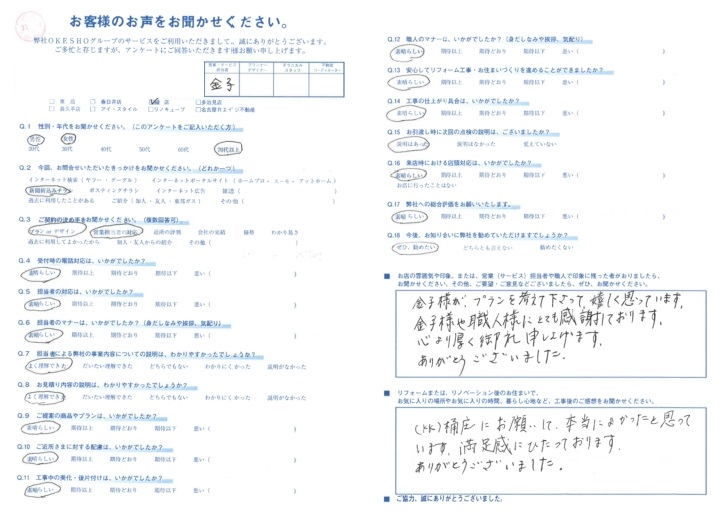 お店の雰囲気や印象。または、営業(サービス)担当者や職人で印象に残った者がおりましたら、お聞かせください。その他、ご要望・ご意見などございましたら、ぜひ、お聞かせください。