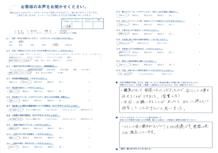 お店の雰囲気や印象。または、営業(サービス)担当者や職人で印象に残った者がおりましたら、お聞かせください。その他、ご要望・ご意見などございましたら、ぜひ、お聞かせください。