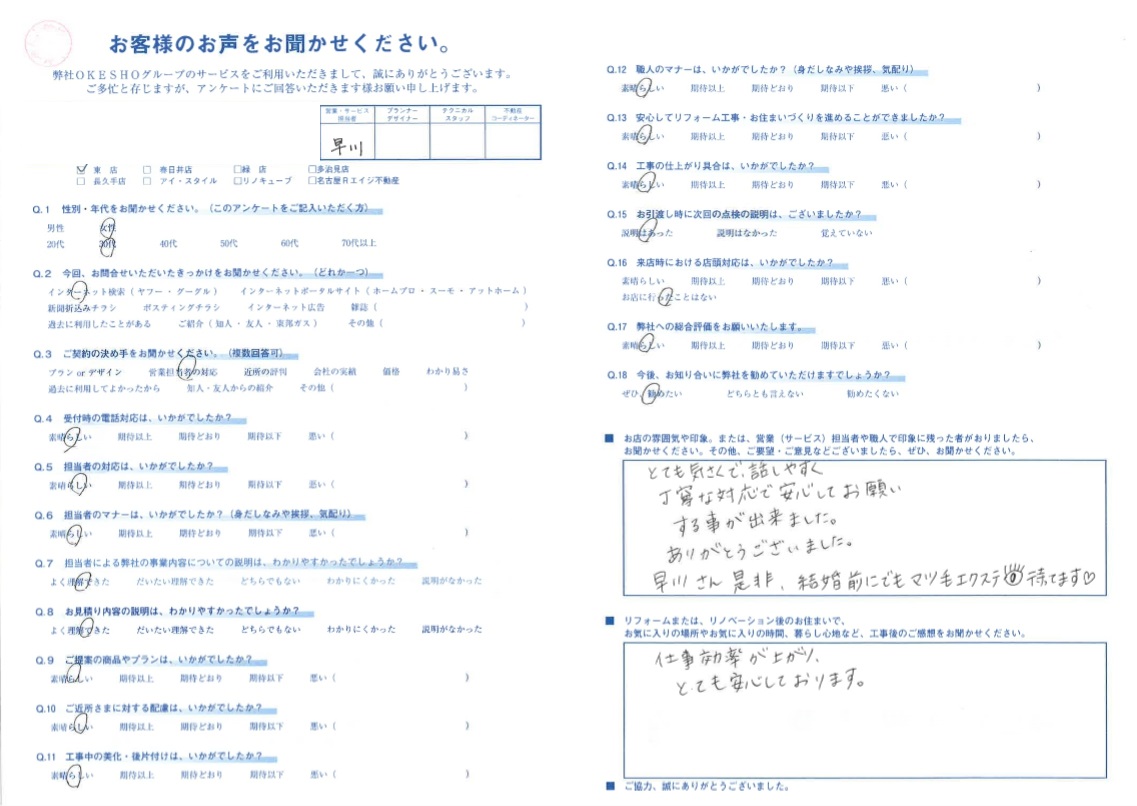お店の雰囲気や印象。または、営業(サービス)担当者や職人で印象に残った者がおりましたら、お聞かせください。その他、ご要望・ご意見などございましたら、ぜひ、お聞かせください。