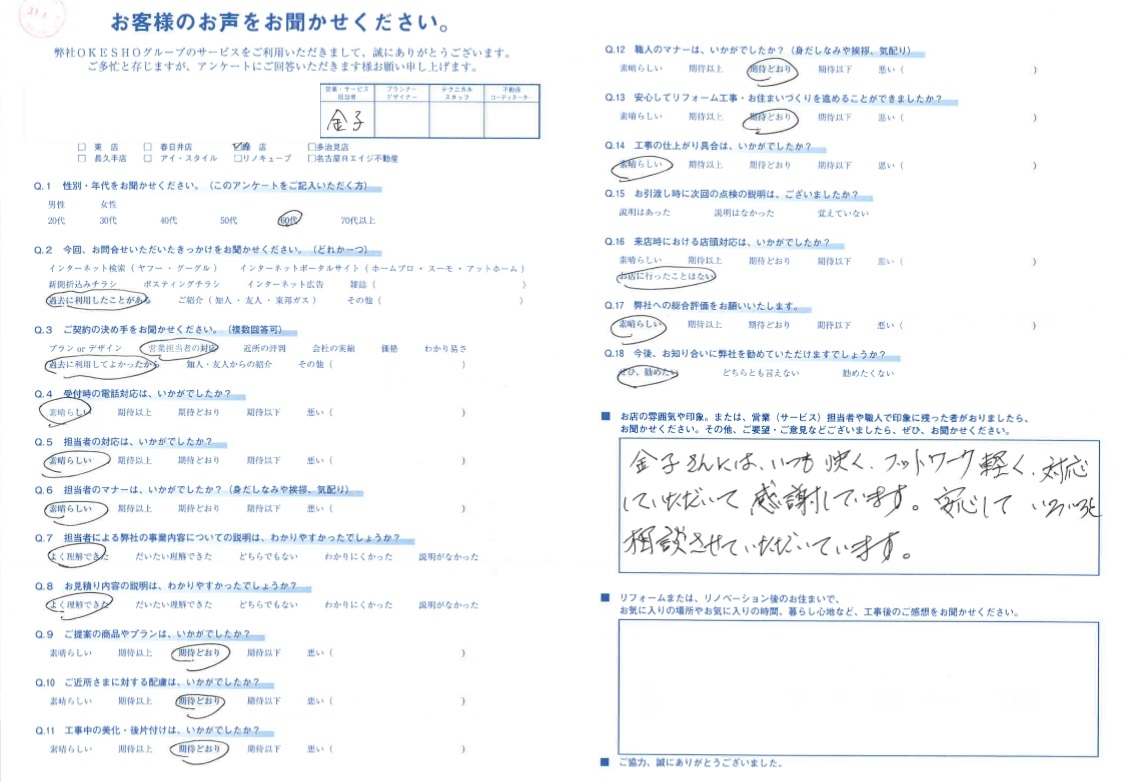お店の雰囲気や印象。または、営業(サービス)担当者や職人で印象に残った者がおりましたら、お聞かせください。その他、ご要望・ご意見などございましたら、ぜひ、お聞かせください。