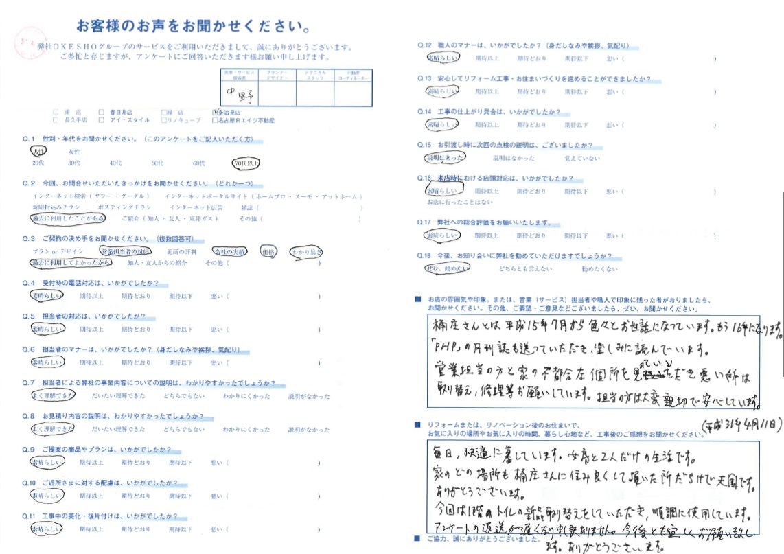 今回は1階のトイレの新品取り替えをしていただき、順調に使用しています。アンケートの返送が遅くなり申し訳ありません。今後とも宜しくお願い致します。ありがとうございます。