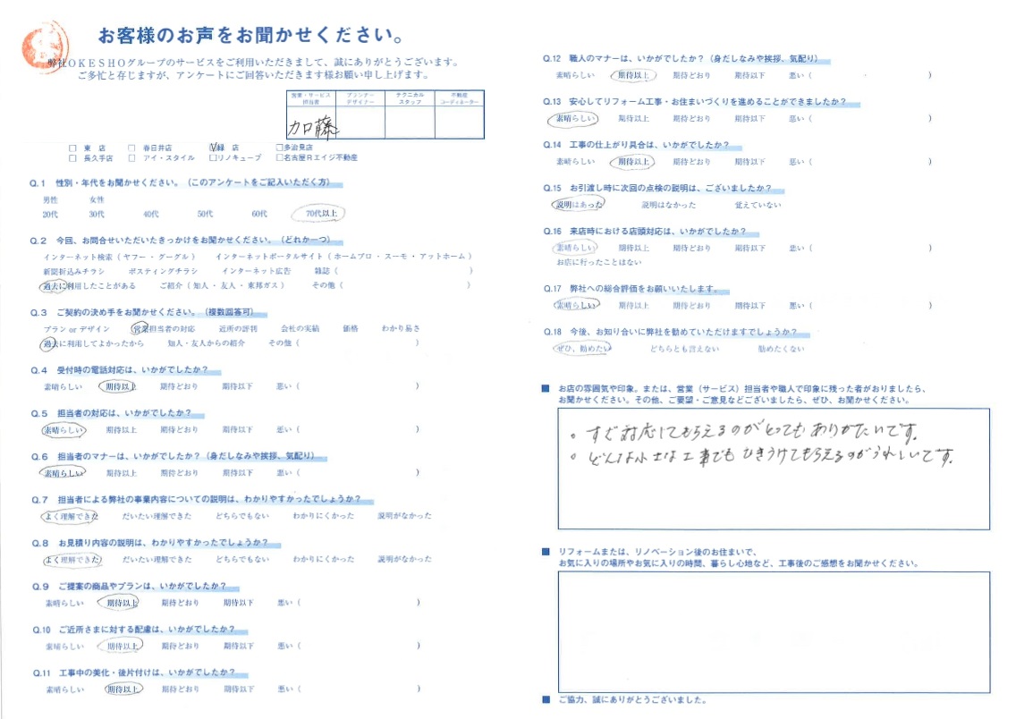 お店の雰囲気や印象。または、営業(サービス)担当者や職人で印象に残った者がおりましたら、お聞かせください。その他、ご要望・ご意見などございましたら、ぜひ、お聞かせください。
