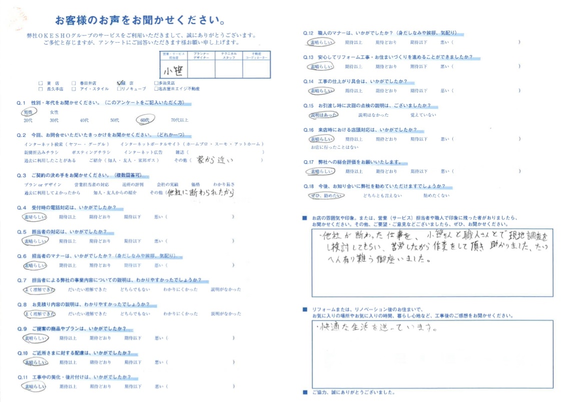 他社が断わった仕事を 小笹さんと職人さんとで現地調査をし 検討してもらい、苦労しながら作業をして頂き 助かりました。たいへん有り難う御座いました。