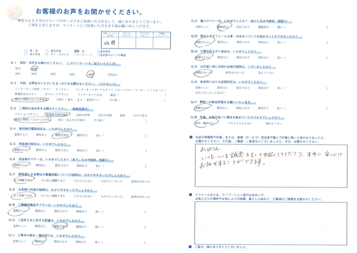 お店の雰囲気や印象。または、営業(サービス)担当者や職人で印象に残った者がおりましたら、お聞かせください。その他、ご要望・ご意見などございましたら、ぜひ、お聞かせください。