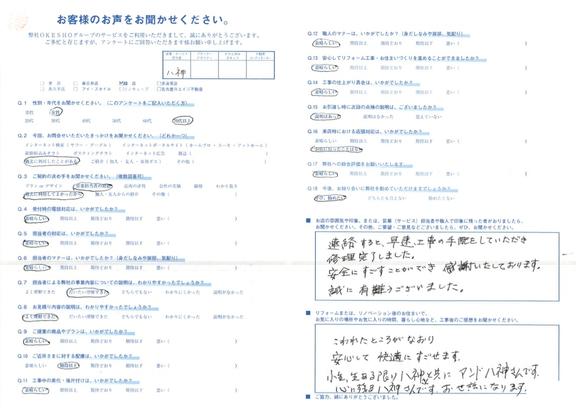 連絡すると、早速 工事の手配をしていただき修理完了しました。