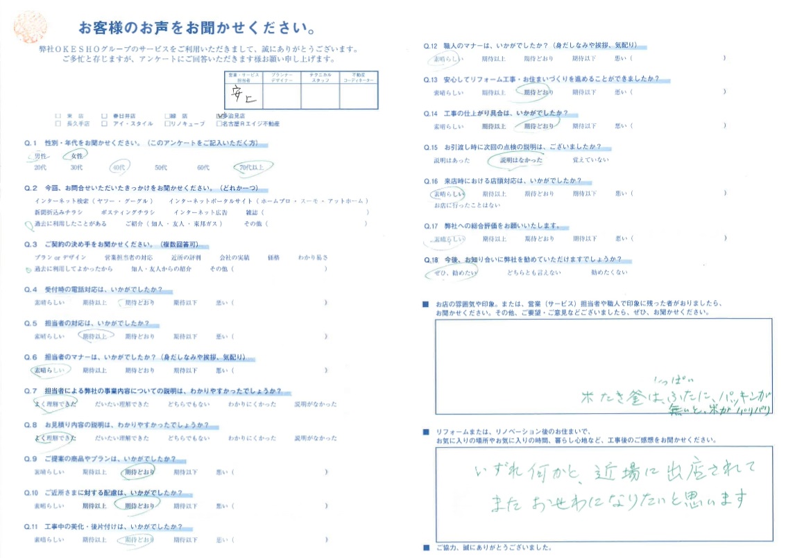 お店の雰囲気や印象。または、営業(サービス)担当者や職人で印象に残った者がおりましたら、お聞かせください。その他、ご要望・ご意見などございましたら、ぜひ、お聞かせください。