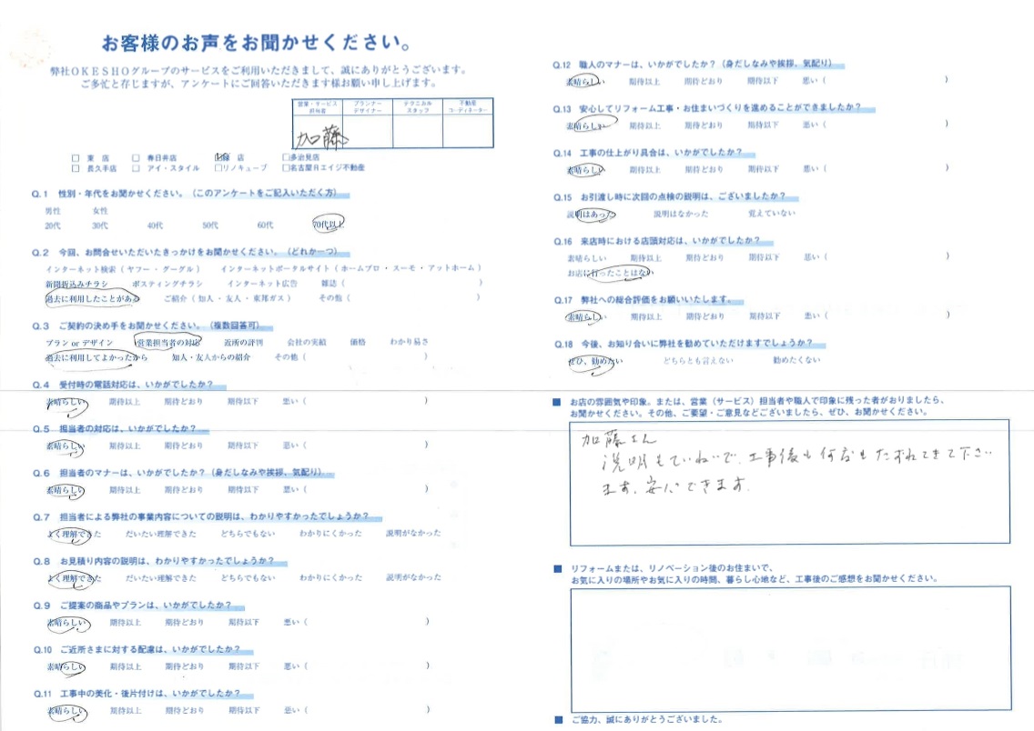 お店の雰囲気や印象。または、営業(サービス)担当者や職人で印象に残った者がおりましたら、お聞かせください。その他、ご要望・ご意見などございましたら、ぜひ、お聞かせください。