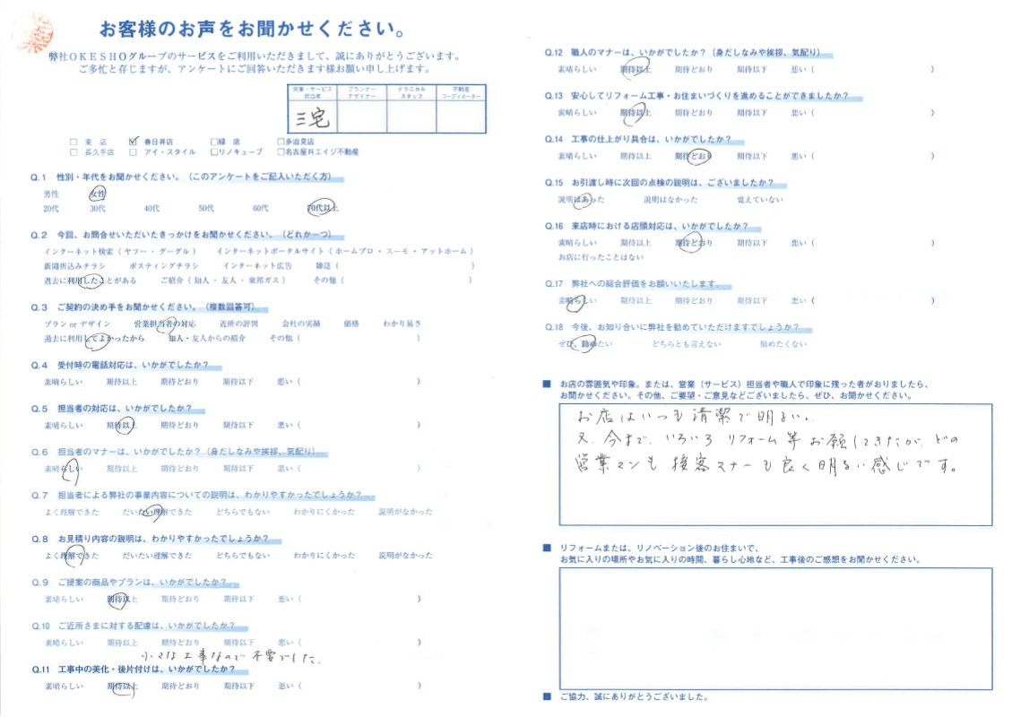又、今までいろいろリフォーム等お願いしてきたが、どの営業マンも接客マナーも良く明るい感じです。