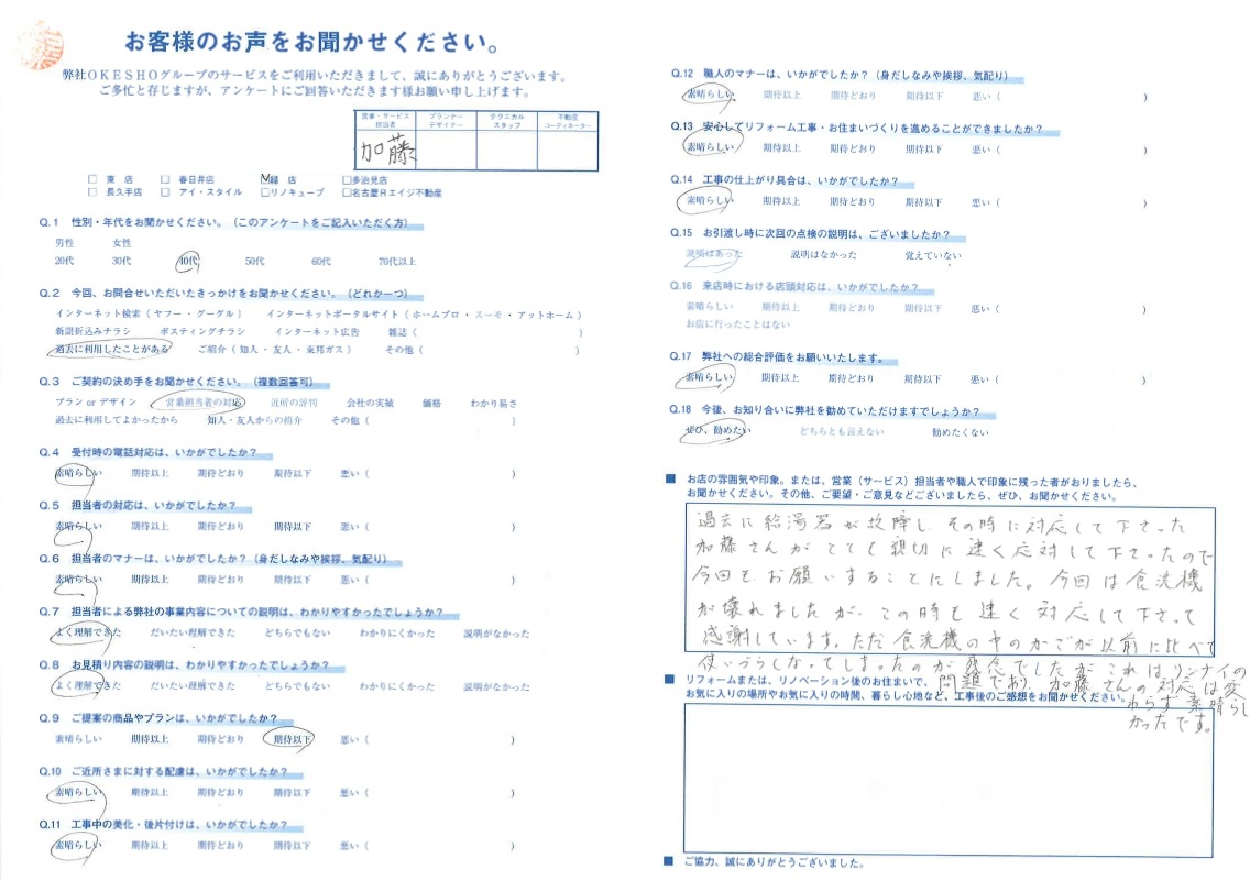 過去に給湯器が故障し その時に対応して下さった加藤さんがとても親切に速く対応して下さったので 今回もお願いすることにしました。今回は食洗器が壊れましたが、この時も速く対応して下さって感謝しています。ただ、食洗器の中のかごが以前に比べて 使いづらくなってしまったのが残念でしたが これはリンナイの問題であり、加藤さんの対応は変わらず素晴らしかったです。