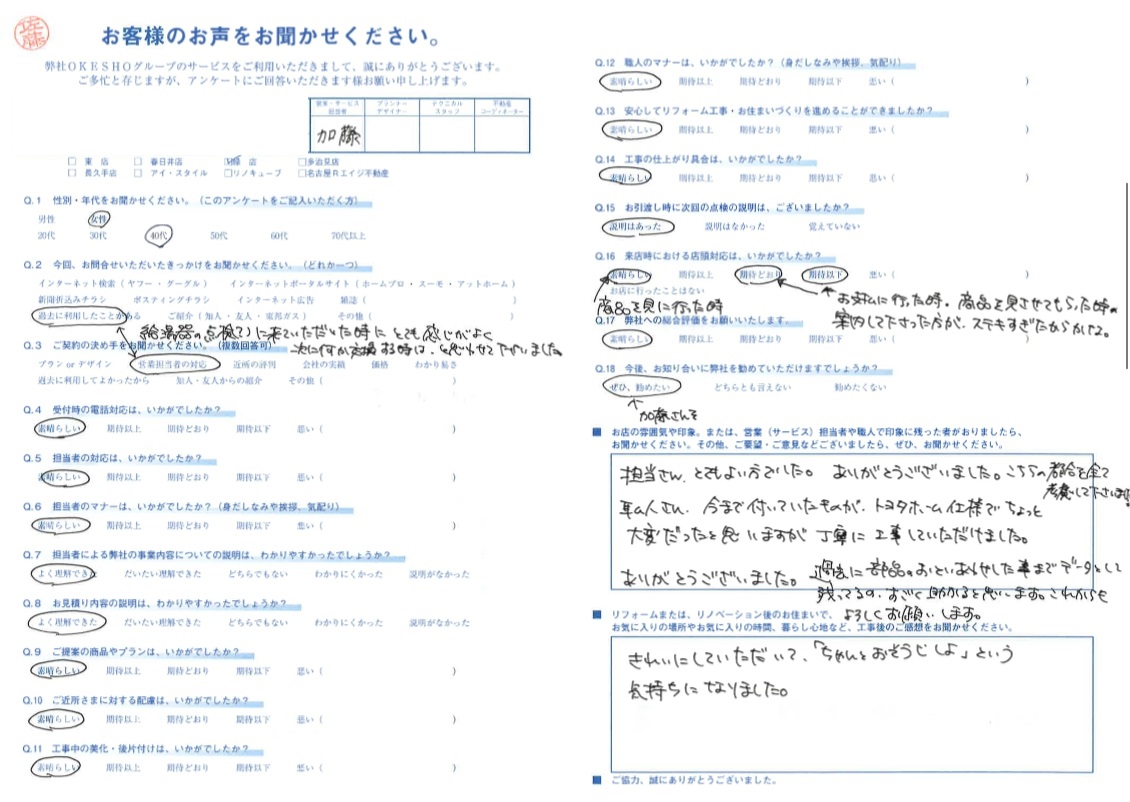 お店の雰囲気や印象。または、営業(サービス)担当者や職人で印象に残った者がおりましたら、お聞かせください。その他、ご要望・ご意見などございましたら、ぜひ、お聞かせください。