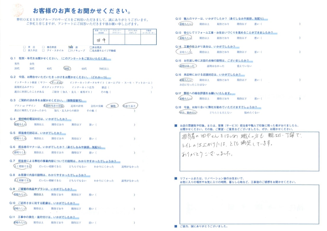 担当者の田中さんをはじめ 職人の方も 親切・丁寧でトイレの仕上がりには、とても満足しています。