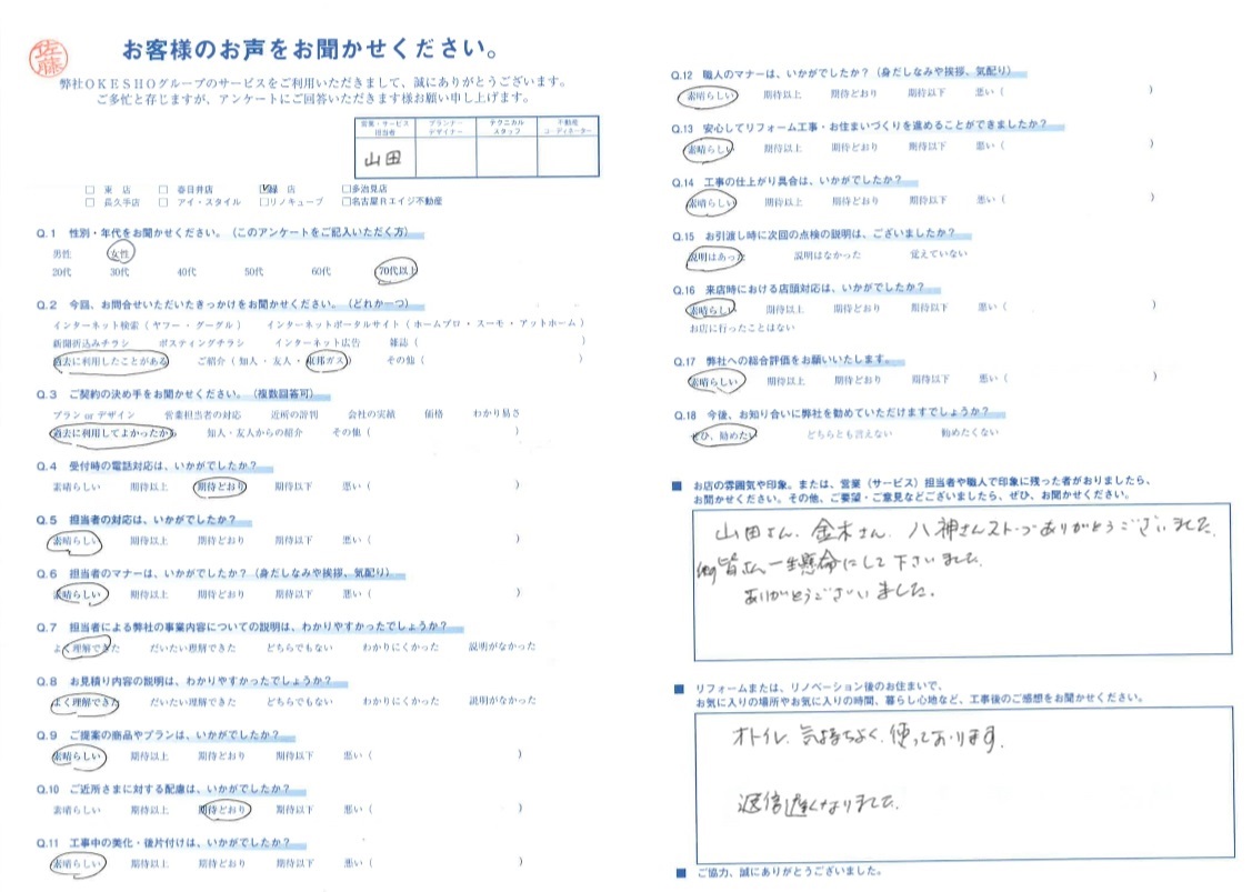お店の雰囲気や印象。または、営業(サービス)担当者や職人で印象に残った者がおりましたら、お聞かせください。その他、ご要望・ご意見などございましたら、ぜひ、お聞かせください。