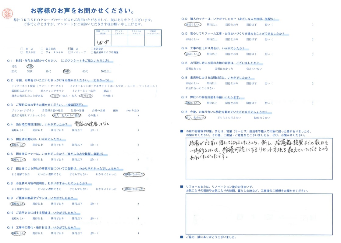 給湯ができずに困っておりましたところ、新しい給湯器設置までの数日を一時的とはいえ 給湯可能にするリセット方法を教えていただき とてもありがたかったです。