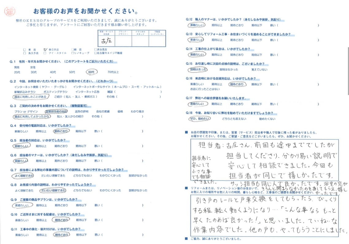 担当者:古庄さん。前回も途中まででしたが担当してくださり、分かり易い説明で安心して相談できました。今回も担当者が同じで嬉しかったです。サッシ担当も同じ人で良かったです。浴室の窓がきちんと閉まらなかったのを直してもらえ、嬉しかったです。