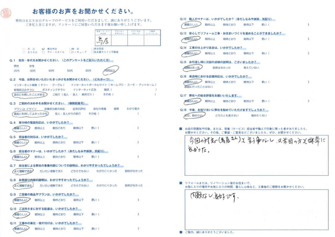 お店の雰囲気や印象。または、営業(サービス)担当者や職人で印象に残った者がおりましたら、お聞かせください。その他、ご要望・ご意見などございましたら、ぜひ、お聞かせください。
