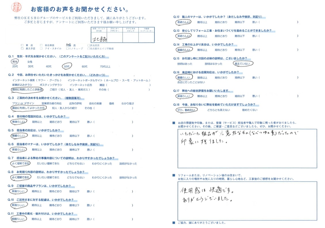 お店の雰囲気や印象。または、営業(サービス)担当者や職人で印象に残った者がおりましたら、お聞かせください。その他、ご要望・ご意見などございましたら、ぜひ、お聞かせください。