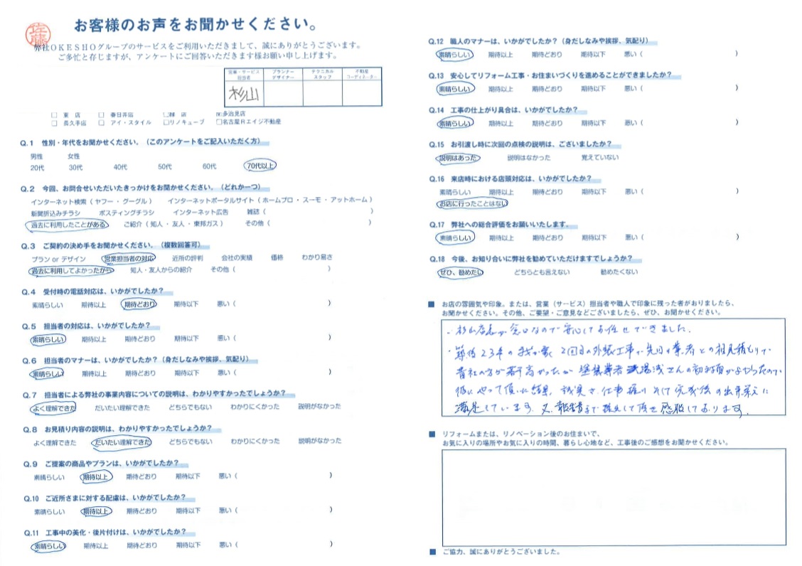 ・築後23年の我が家 2回目の外装工事で先回の業者との相見積もりで 貴社の方が若干高かったが 塗装業者 湯浅さんの初対面がよかったので彼にやって頂いた結果 誠実さ 仕事振り そして完成後の出来栄えに満足しています。又、報告書まで提出して頂き感服しております。