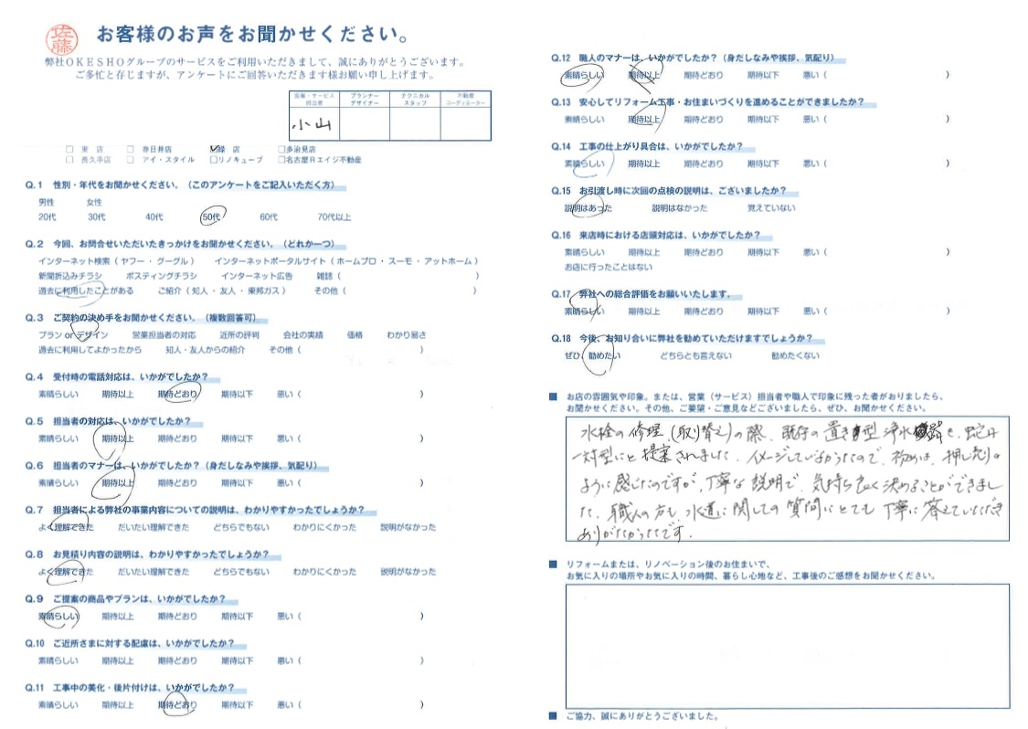 水栓の修理(取り替え)の際、既存の置き型浄水器を蛇口一対型にと提案されました。イメージしていなかったので 初めは押し売りのように感じたのですが、丁寧な説明で 気持ち良く決めることができました。職人の方も水道に関しての質問に とても丁寧に答えていただき ありがたかったです。