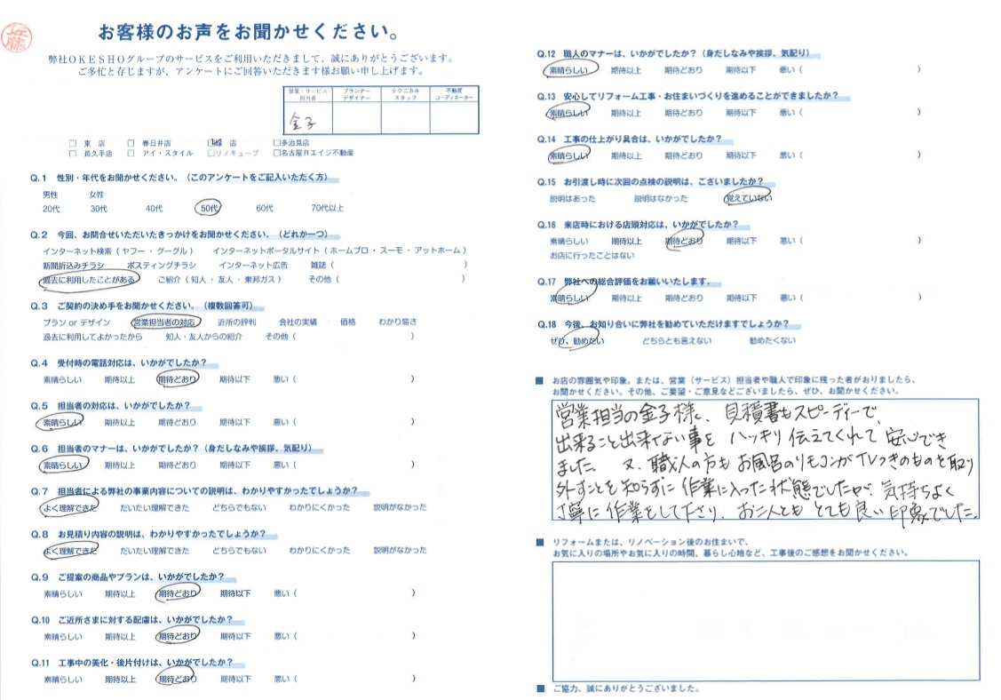 お店の雰囲気や印象。または、営業(サービス)担当者や職人で印象に残った者がおりましたら、お聞かせください。その他、ご要望・ご意見などございましたら、ぜひ、お聞かせください。