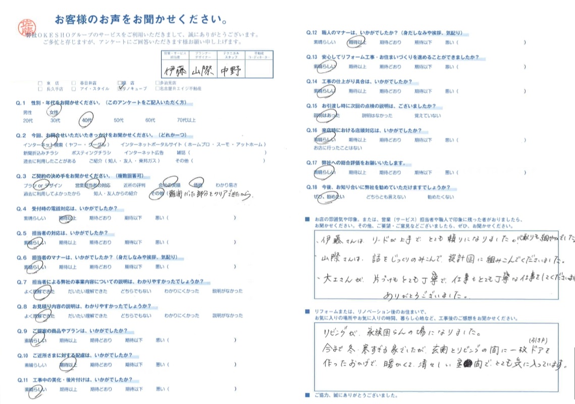 お店の雰囲気や印象。または、営業(サービス)担当者や職人で印象に残った者がおりましたら、お聞かせください。その他、ご要望・ご意見などございましたら、ぜひ、お聞かせください。