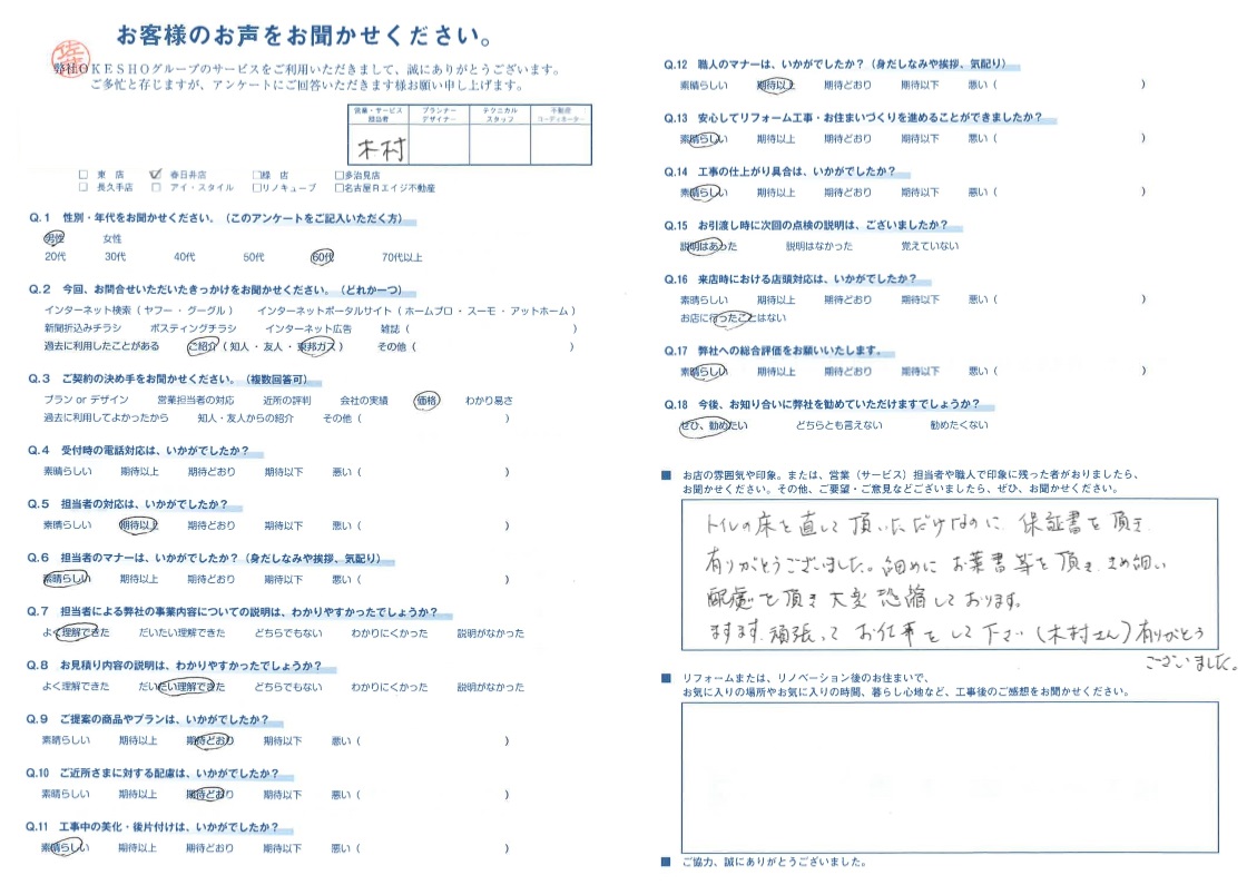 トイレの床を直して頂いただけなのに 保証書を頂き 有りがとうございました。細めにお葉書等を頂き、きめ細かい配慮を頂き大変恐縮しております。