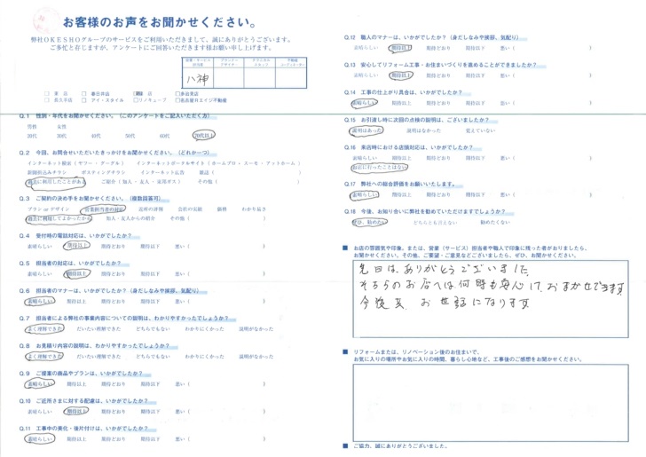 お店の雰囲気や印象。または、営業(サービス)担当者や職人で印象に残った者がおりましたら、お聞かせください。その他、ご要望・ご意見などございましたら、ぜひ、お聞かせください。