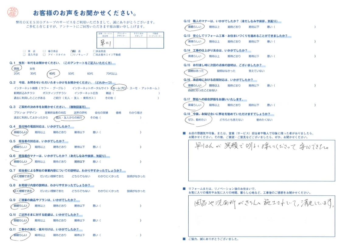 お店の雰囲気や印象。または、営業(サービス)担当者や職人で印象に残った者がおりましたら、お聞かせください。その他、ご要望・ご意見などございましたら、ぜひ、お聞かせください。