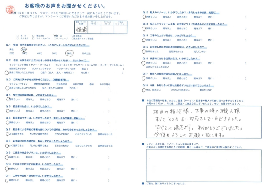 担当の稲浦様、工事の時の職人様、すべて とてもよい対応をしていただきました。すべてに満足です。ありがとうございました。今後もよろしくお願い致します。
