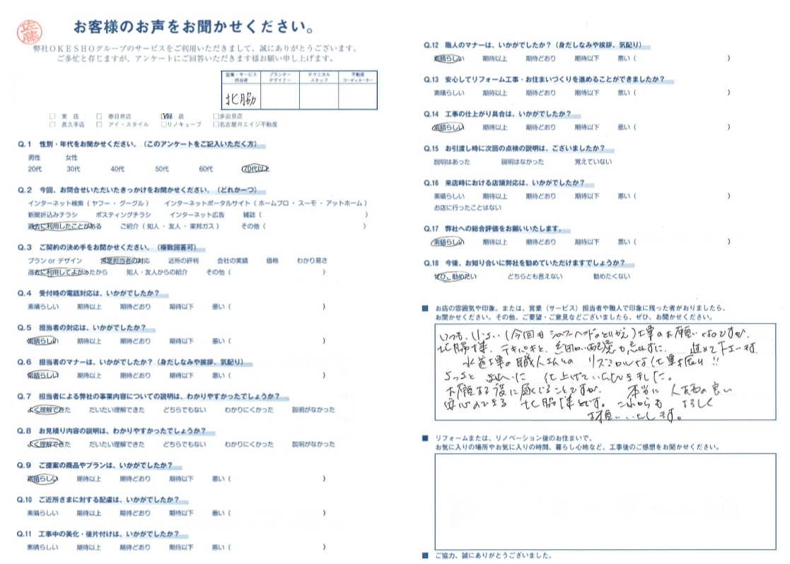 お店の雰囲気や印象。または、営業(サービス)担当者や職人で印象に残った者がおりましたら、お聞かせください。その他、ご要望・ご意見などございましたら、ぜひ、お聞かせください。