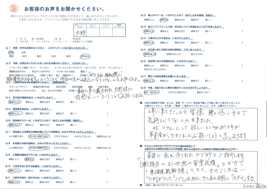 お店の雰囲気や印象。または、営業(サービス)担当者や職人で印象に残った者がおりましたら、お聞かせください。その他、ご要望・ご意見などございましたら、ぜひ、お聞かせください。