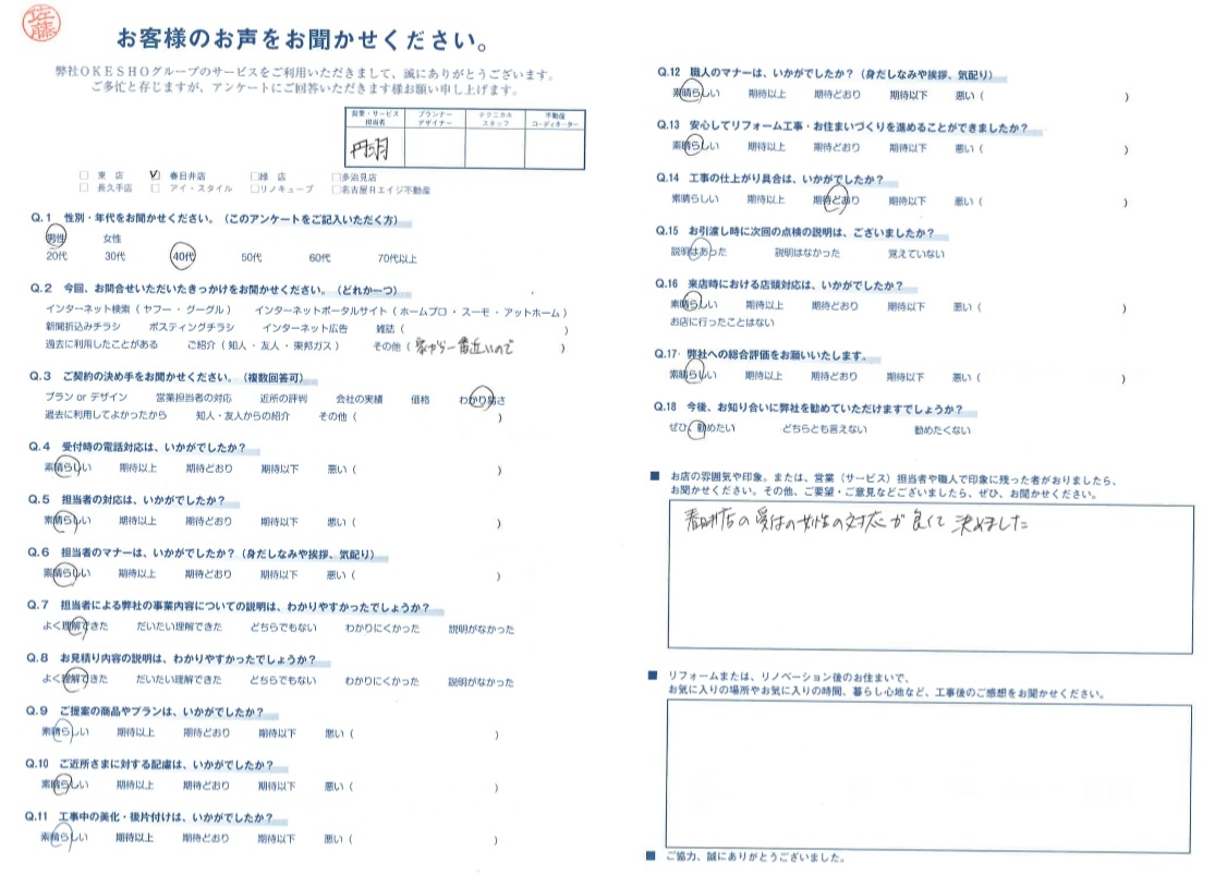 お店の雰囲気や印象。または、営業(サービス)担当者や職人で印象に残った者がおりましたら、お聞かせください。その他、ご要望・ご意見などございましたら、ぜひ、お聞かせください。