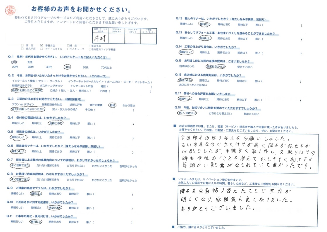 古い家屋なので 立て付けが悪く障子が外せるか心配でしたが、手際良く取り外し、又取り付けの時も今後の事を考えて 外しやすく加工する等細かい配慮がなされいて良かったです。