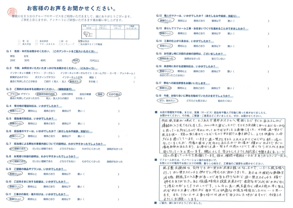 今回 風呂釜が壊れて、とりあえず東邦ガスさんへ電話したら すぐに安上さんから連絡が入り見てもらえました。2003年の釜だったので、そろそろ交換しないとあぶないかなと思っていた所だったので 早めにやっておけばよかったと後悔しました。4日程 追い焚きで風呂を使い、早急に取り寄せていただいたので半日弱で工事も終了し、とても快適な入浴タイムを過ごしています。いままで追い焚きをすると 2穴の上からじわじわと熱い湯になっていましたが、今度の釜は1穴なのと あたたかいお湯が横から回るので すぐに湯舟全体があたたまり、お湯はりも追い焚きも以前にくらべて早くなりガス代も多分安くなっていると思います。職人さんも、安上さんも とても対応良く手際も良くあっという間に作業していただき感謝しています。後日、確認の電話もいただき ありがとうございました。