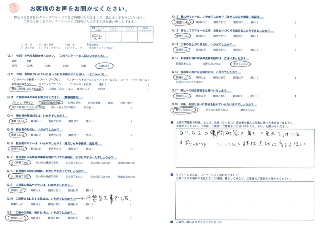 お店の雰囲気や印象。または、営業(サービス)担当者や職人で印象に残った者がおりましたら、お聞かせください。その他、ご要望・ご意見などございましたら、ぜひ、お聞かせください。