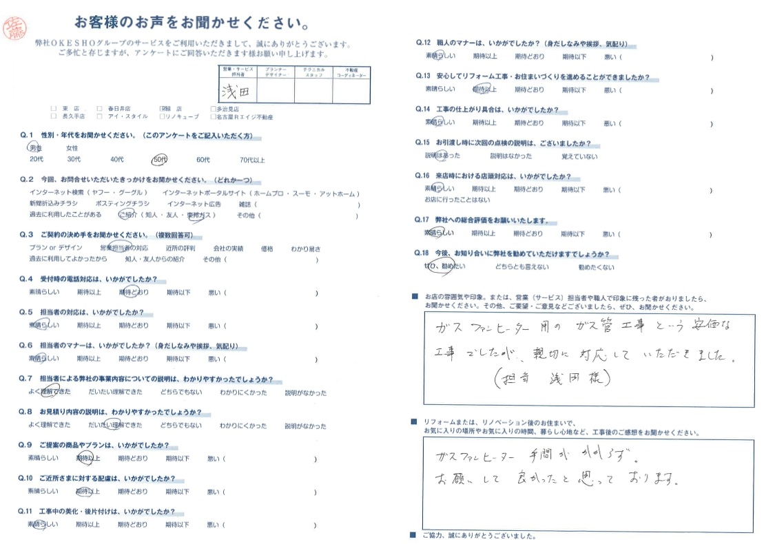 ガスファンヒーター用のガス管工事という安価な工事でしたが、親切に対応していただきました。(担当 浅田様)