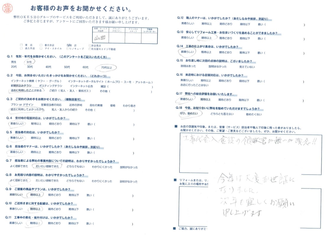 お店の雰囲気や印象。または、営業(サービス)担当者や職人で印象に残った者がおりましたら、お聞かせください。その他、ご要望・ご意見などございましたら、ぜひ、お聞かせください。