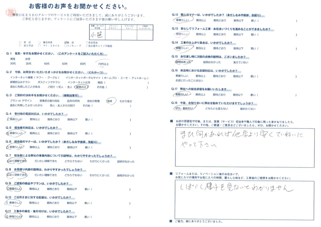 お店の雰囲気や印象。または、営業(サービス)担当者や職人で印象に残った者がおりましたら、お聞かせください。その他、ご要望・ご意見などございましたら、ぜひ、お聞かせください。