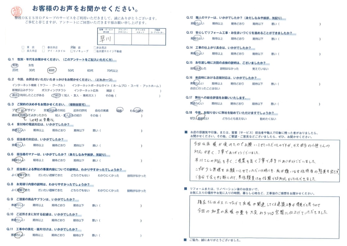 今回は床暖が壊れたので お願いさせていただいたのですが、ガス担当の小笹さんの対応が早く丁寧で ありがとうございました。
