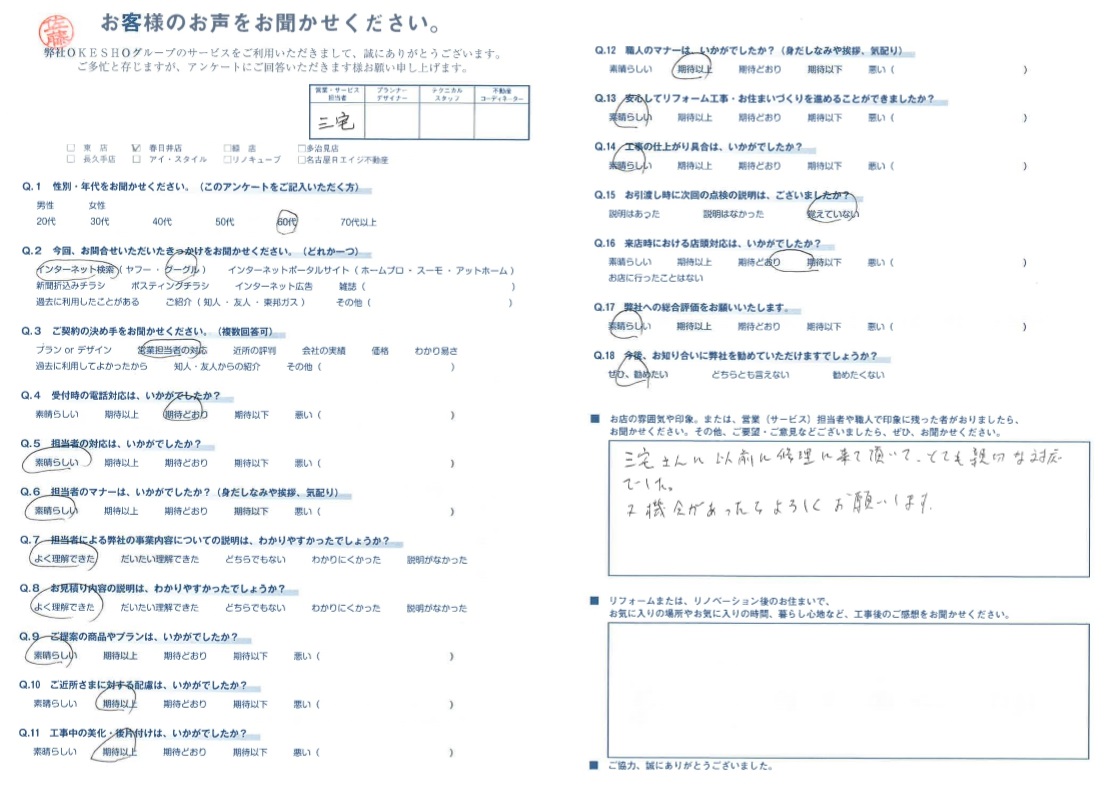 お店の雰囲気や印象。または、営業(サービス)担当者や職人で印象に残った者がおりましたら、お聞かせください。その他、ご要望・ご意見などございましたら、ぜひ、お聞かせください。