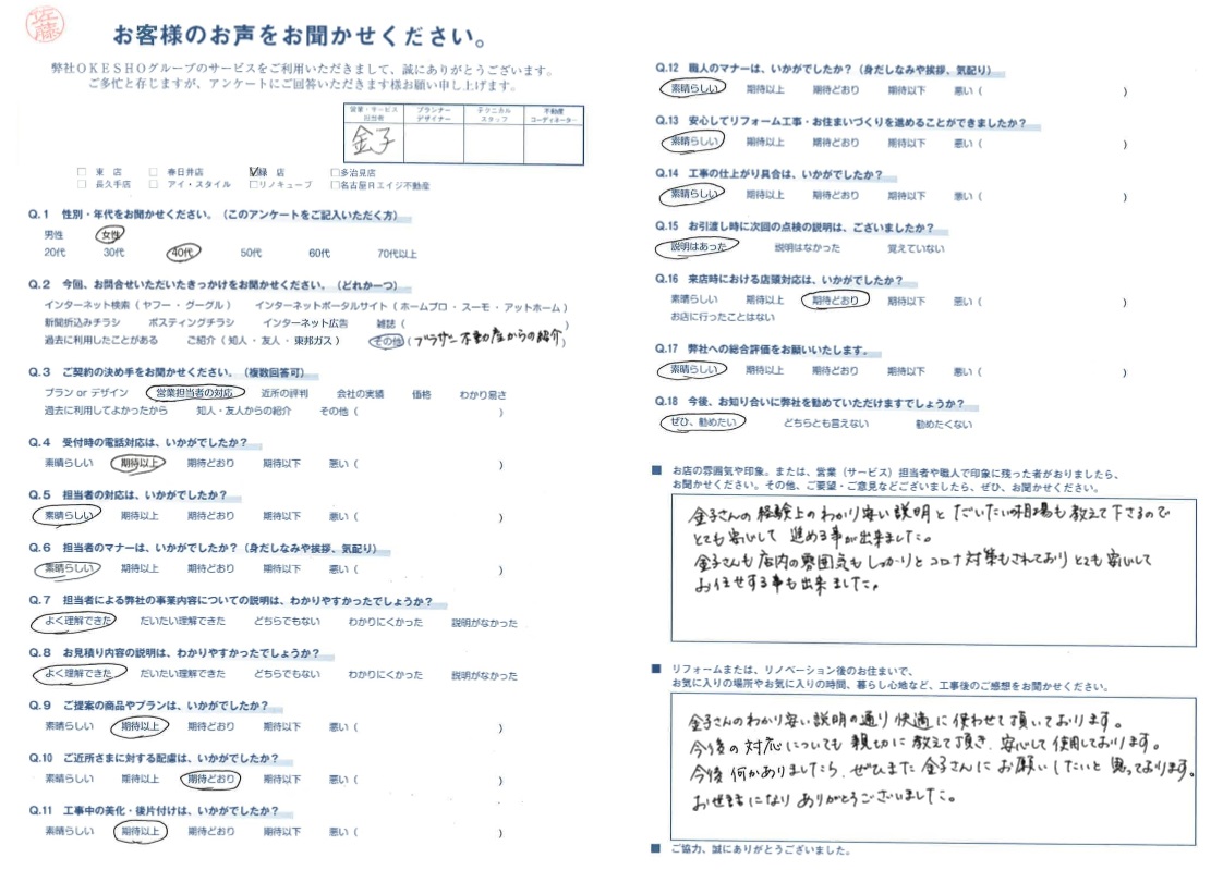 お店の雰囲気や印象。または、営業(サービス)担当者や職人で印象に残った者がおりましたら、お聞かせください。その他、ご要望・ご意見などございましたら、ぜひ、お聞かせください。
