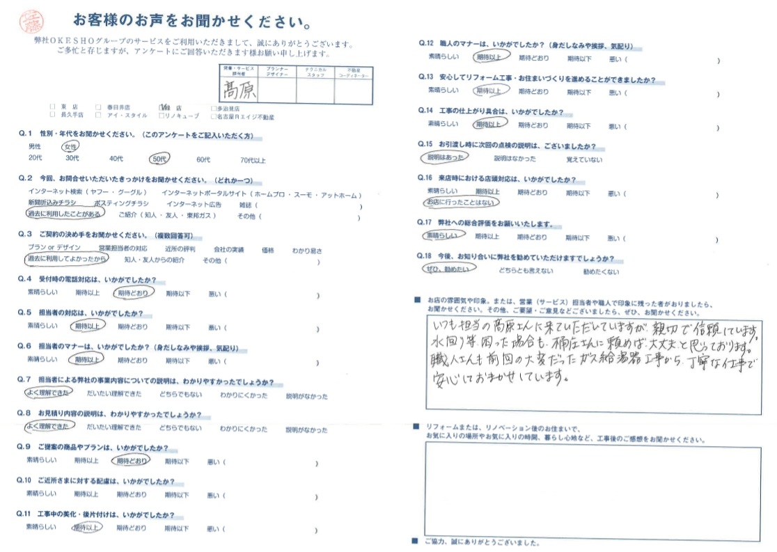いつも担当の髙原さんに来ていただいていますが、親切で信頼しています。水回り等困った場合も、桶庄さんに頼めば大丈夫と思っております。職人さんも前回の大変だったガス給湯器工事から 丁寧な仕事で安心しておまかせしています。