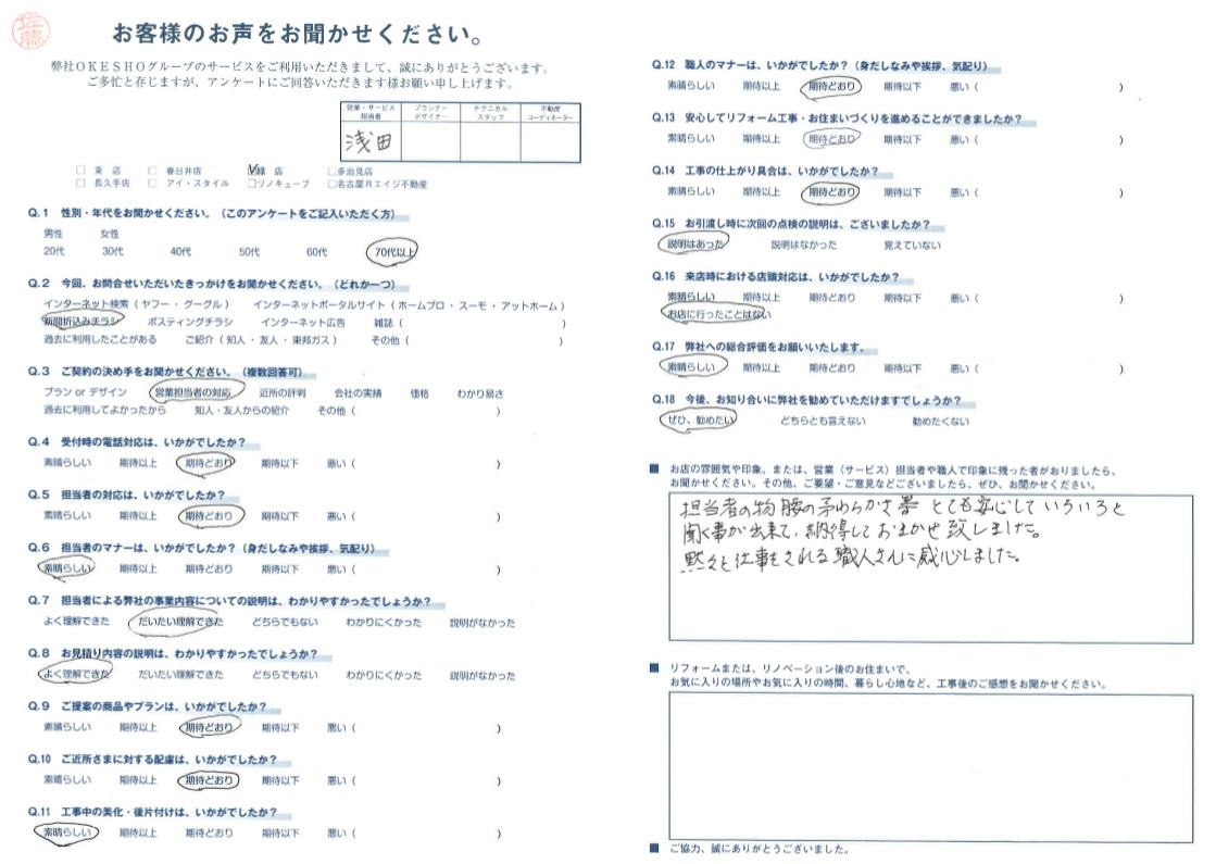 お店の雰囲気や印象。または、営業(サービス)担当者や職人で印象に残った者がおりましたら、お聞かせください。その他、ご要望・ご意見などございましたら、ぜひ、お聞かせください。