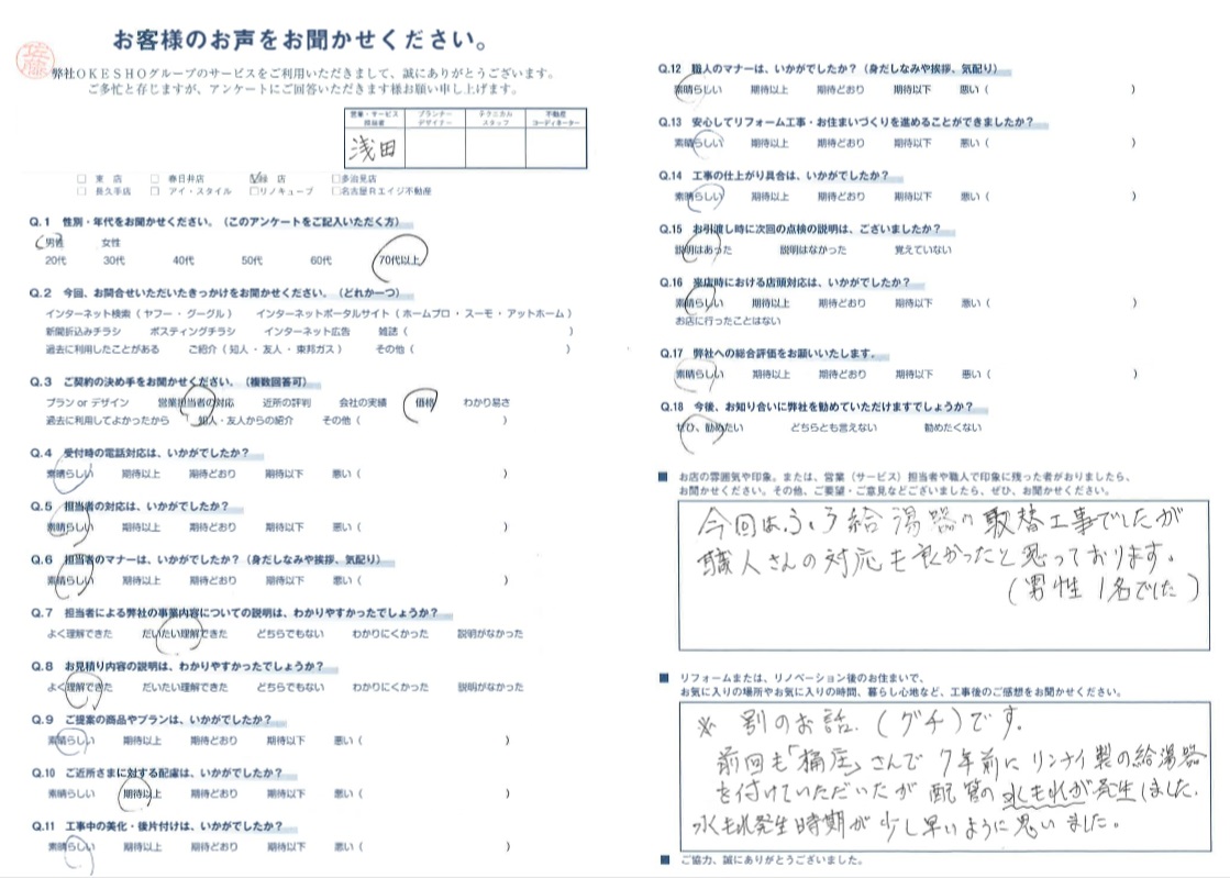 前回も「桶庄」さんで7年前にリンナイ製の給湯器を付けていただいたが配管の水もれが発生しました。水もれ発生時期が少し早いように思いました。