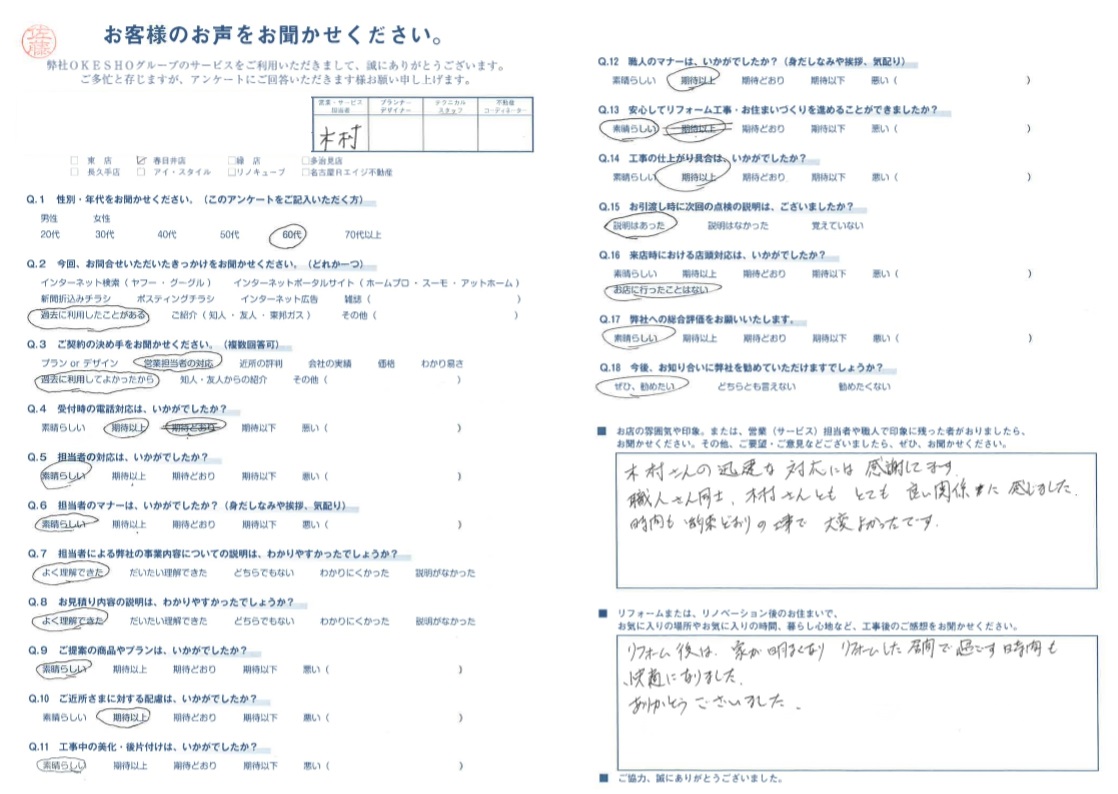 お店の雰囲気や印象。または、営業(サービス)担当者や職人で印象に残った者がおりましたら、お聞かせください。その他、ご要望・ご意見などございましたら、ぜひ、お聞かせください。